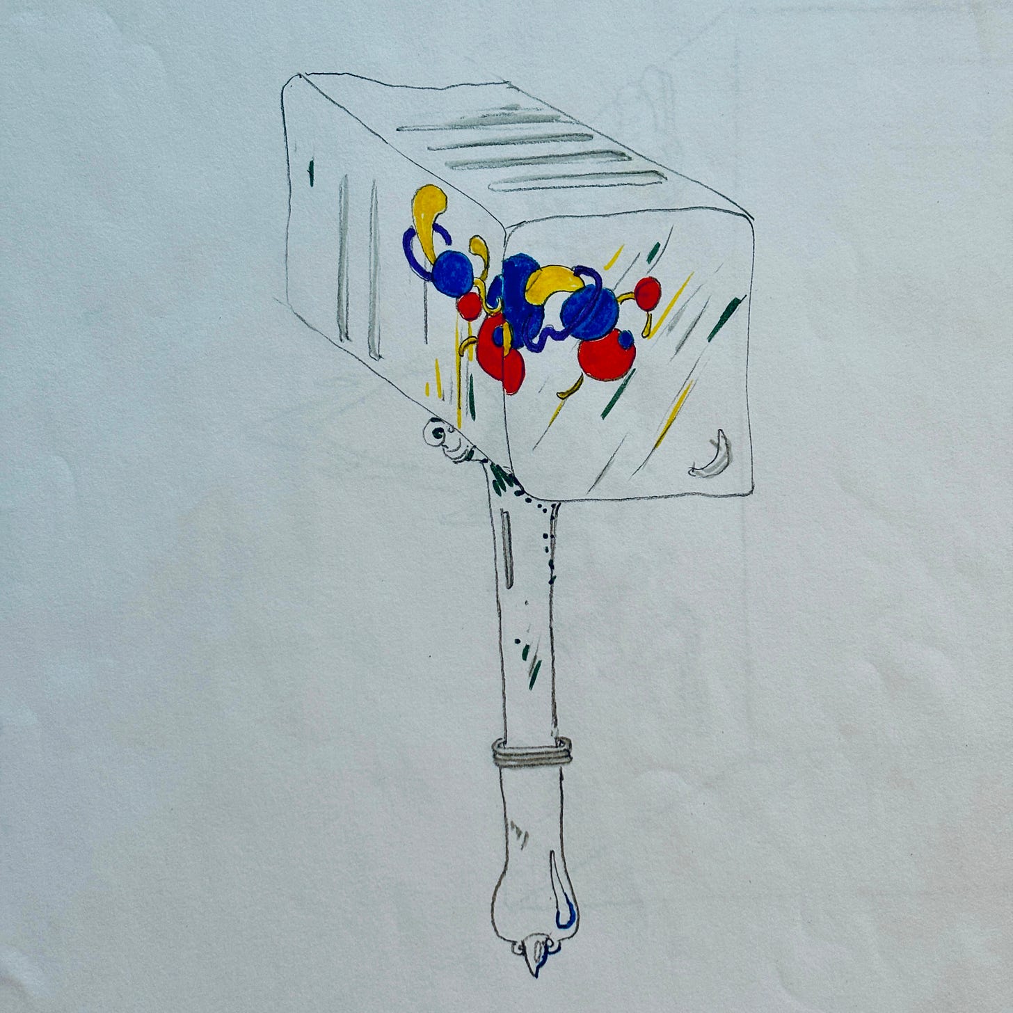I found four pieces of a large warhammer (like Thor’s hammer, mjolnir). This hammer is called ‘scrolnir.’ The pieces are look like they’re made of glass or ice - clear, transparent, jigsaw pieces that fit together. They have little colourful bobbles inside them, floating blobs of colour (kind of like frozen fruit, different sized coloured, beads, or bubbles) and threads (like liquid swirling strings). It looks kind of like actual blown glass art, but not exactly – this is like there are actual things inside the glass pieces.